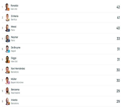 欧冠历史助攻榜:德布劳内进前5,C罗居首梅西第三