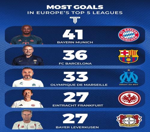 • 本赛季五大联赛俱乐部进球榜TOP5:拜仁11轮41球第1,巴萨第2