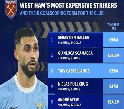 德转统计了西汉姆联队史引进花费最多的十名锋线球员,其中,阿莱以5000万欧元的转会费排名榜首,斯卡马卡第二,今年...