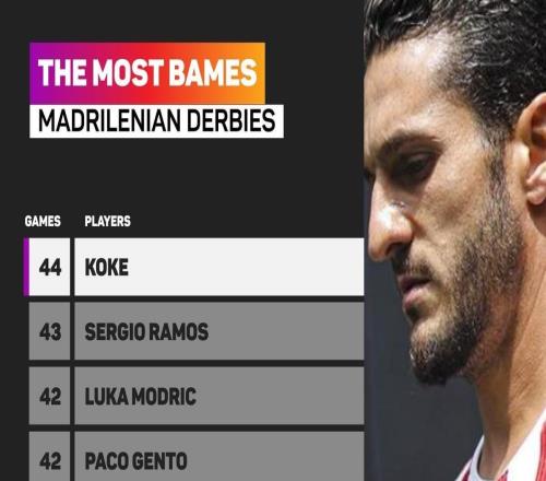 科克第43次出战马德里德比,追平拉莫斯并列历史最多