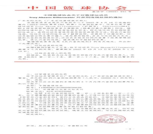 北京时间10月13日晚8点45分,中国篮协正式官宣,公布了对兴奋剂违规的广东远队前外援吉伦沃特的处罚结果。