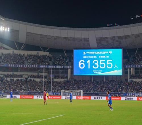 10月4日,大屏幕显示本场比赛共有61355名球迷到场观赛。 “苏超”四分之一决赛中,南京队主场与连云港队在常规时间1比1战平,通过点球大战,南京队以5比3的总比分战胜连云港队,晋级半决赛。 新华社发