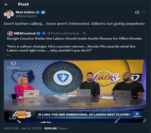 随后,太阳队老板马特-伊什比亚转发了考辛斯的这段发言,并否决了这一提议:“别费劲心思打电话了,太阳队没兴趣做这笔交易。狄龙哪儿也不会去。”